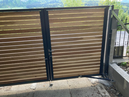 Da kein elektrischer Antrieb vorgesehen war, wurde ein DICTATOR-Öldämpfer für Drehtore mit steigenden Bändern eingesetzt. Dieser bremst den Torflügel beim Schließen auf eine einstellbare Geschwindigkeit ab und sorgt für ein kontrolliertes, leises Schließen.
